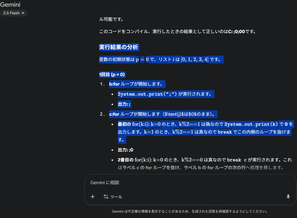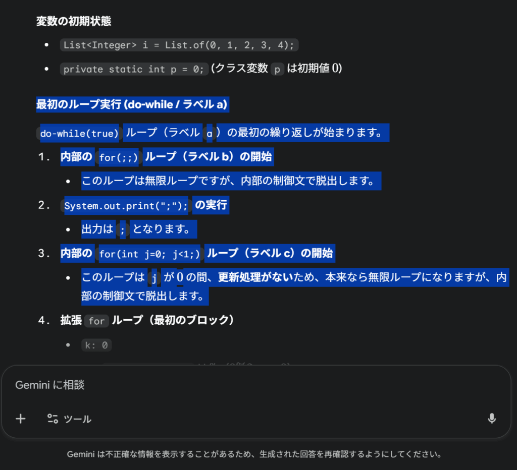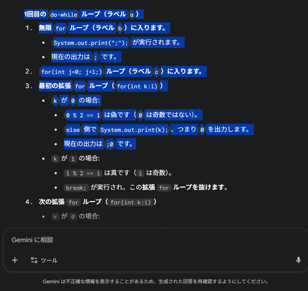 最初のループ実行 (do-while / ラベル a)do-while(true) ループ(ラベル a)の最初の繰り返しが始まります。内部の for(;;) ループ(ラベル b)の開始このループは無限ループですが、内部の制御文で脱出します。System.out.print(“;”); の実行出力は ; となります。内部の for(int j=0; j<1;) ループ(ラベル c)の開始このループは j が $0$ の間、更新処理がないため、本来なら無限ループになりますが、内部の制御文で脱出します。これで改善されたしかし、数値などが、$0$、のように$で囲まれてしまう。そこで、追加で答えるときはすべての数値や変数も文字列として表示してもらうように頼んだ。